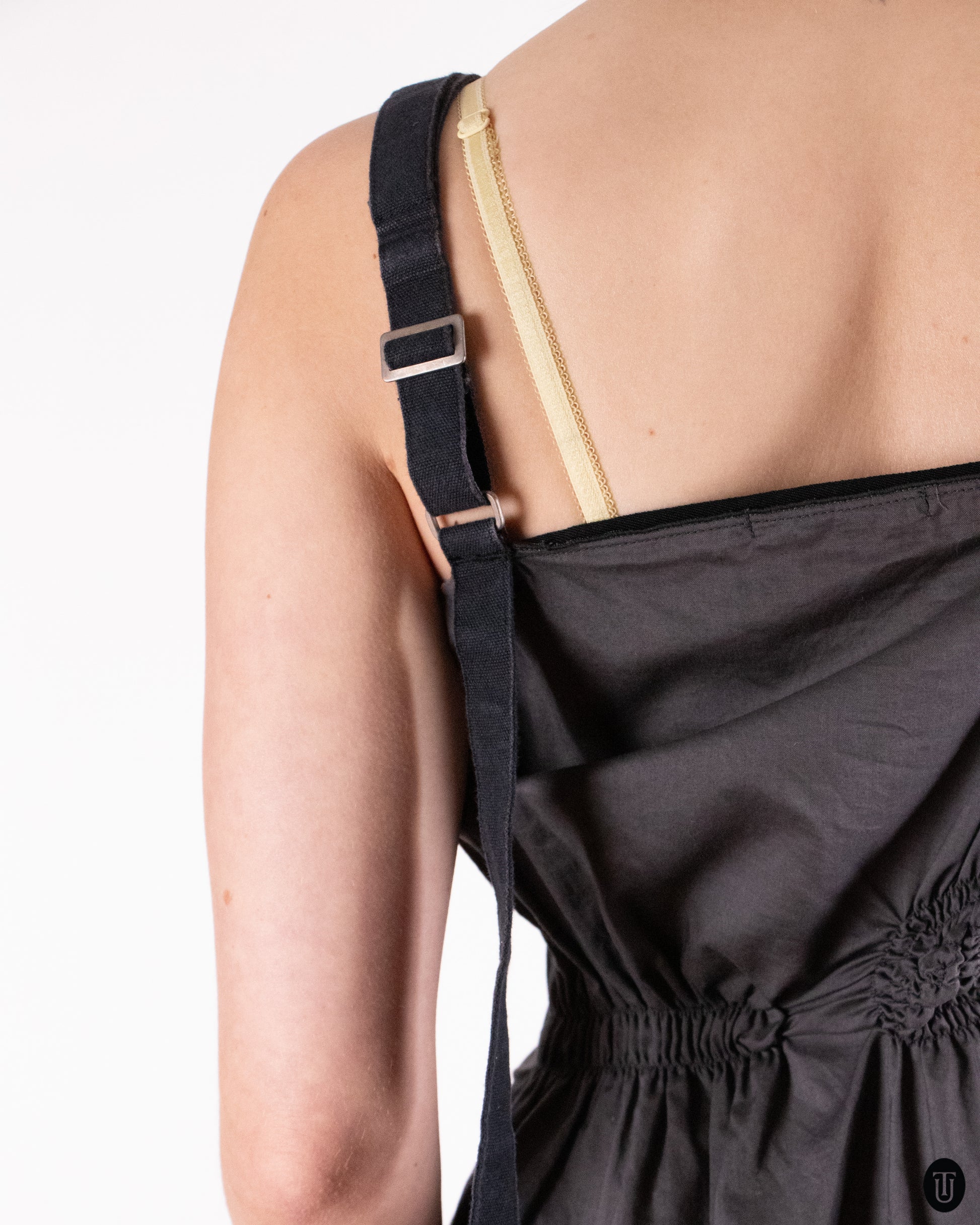 This 2000s Marithé + François Girbaud top is crafted in lightweight gray cotton. The adjustable strap hardware and gathered waist introduce a functional, almost industrial note, while the asymmetric hem and fluid volume add movement and softness. True to Girbaud’s design language, this piece challenges conventional proportions without sacrificing wearability.