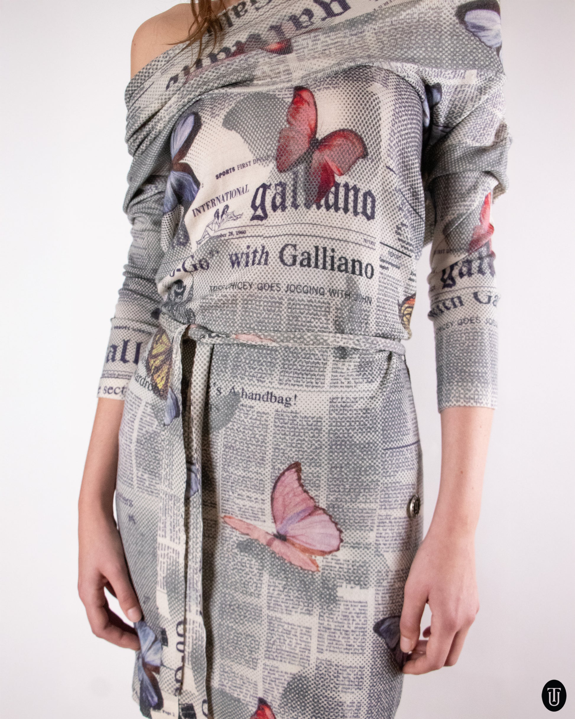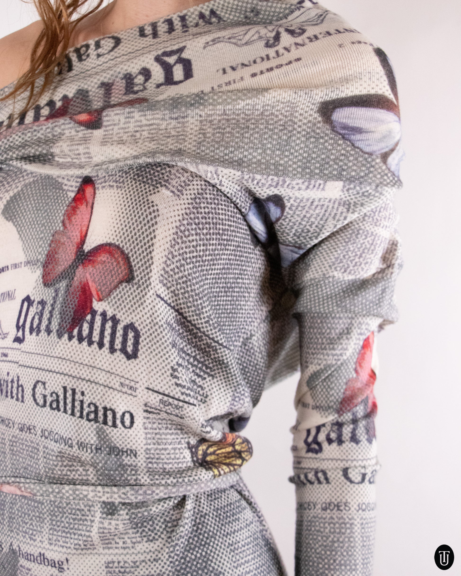 This fitted dress by John Galliano from the early 2000s features his iconic newspaper-style print layered with soft butterfly motifs. The dress is cut with an off-shoulder neckline and accompanied by a self-tie belt that allows the fit to be adjusted at the waist while the jersey fabric hugs the figure. A highly recognizable Galliano motif from the period, and a strong example of his ability to merge romance with graphic provocation.