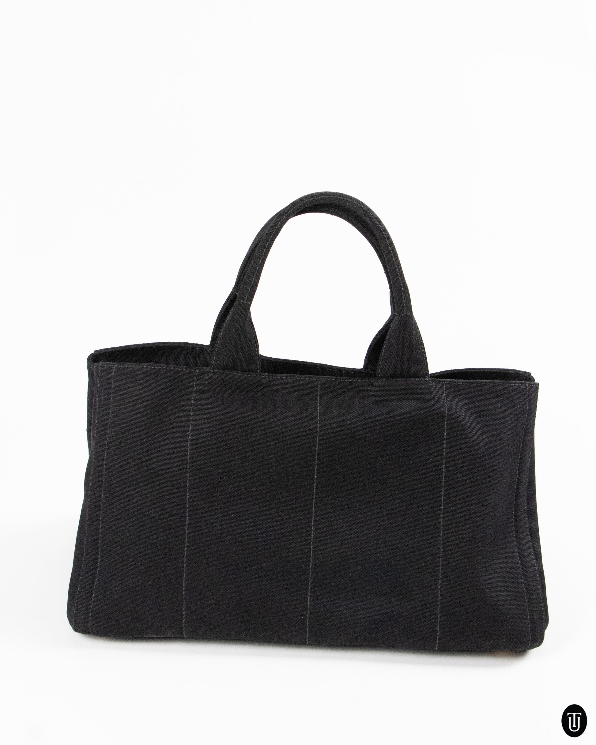 A signature early-2000s Prada tote crafted in black Canapa canvas, elevated with precision-set rhinestone studs framing the silhouette. The structured yet lightweight body features clean panel construction, rolled top handles, and the iconic enameled triangle plaque at center front. Equal parts utilitarian and glam, this piece captures Prada’s Y2K-era tension between industrial materials and refined embellishment, with unmistakable runway edge.
