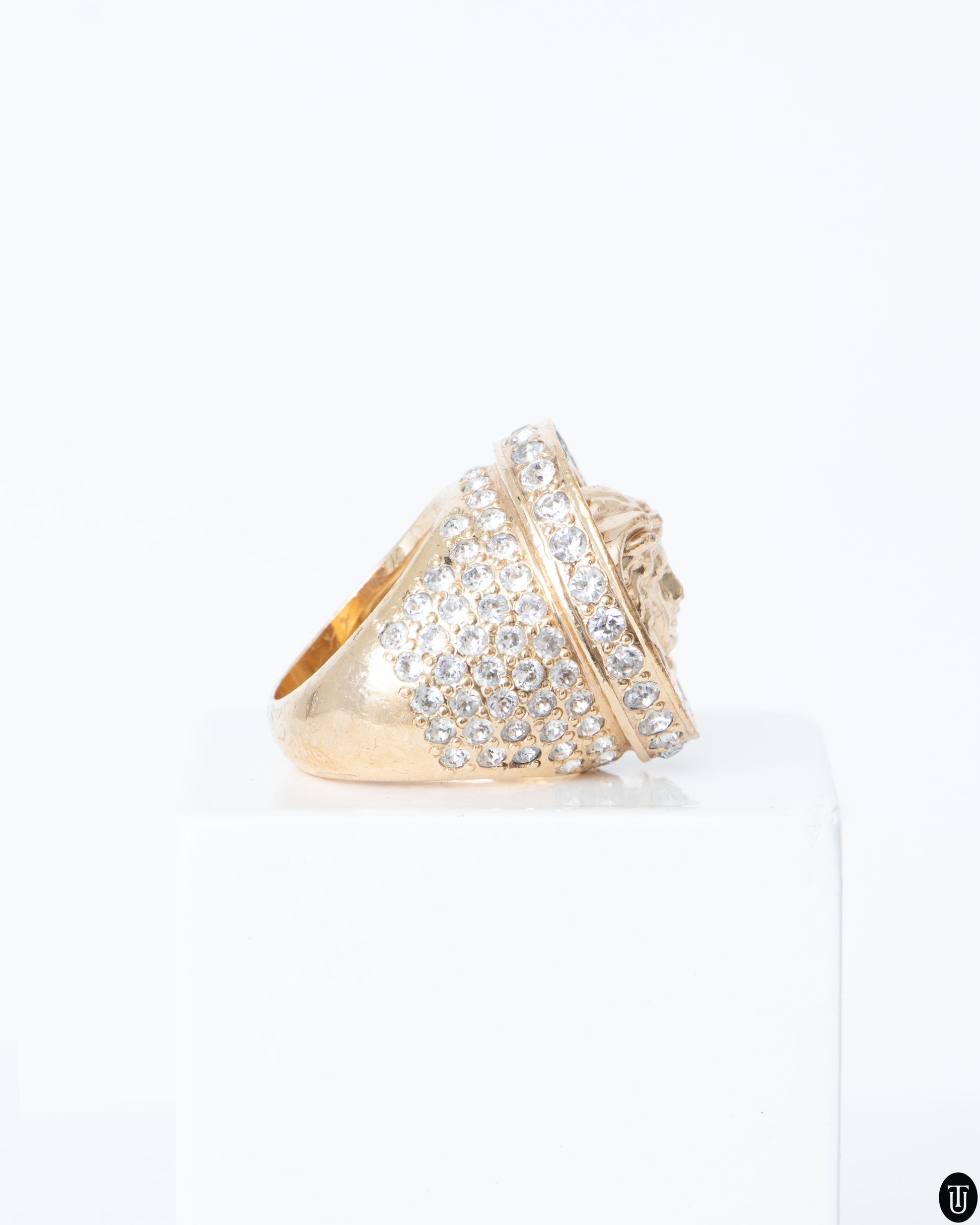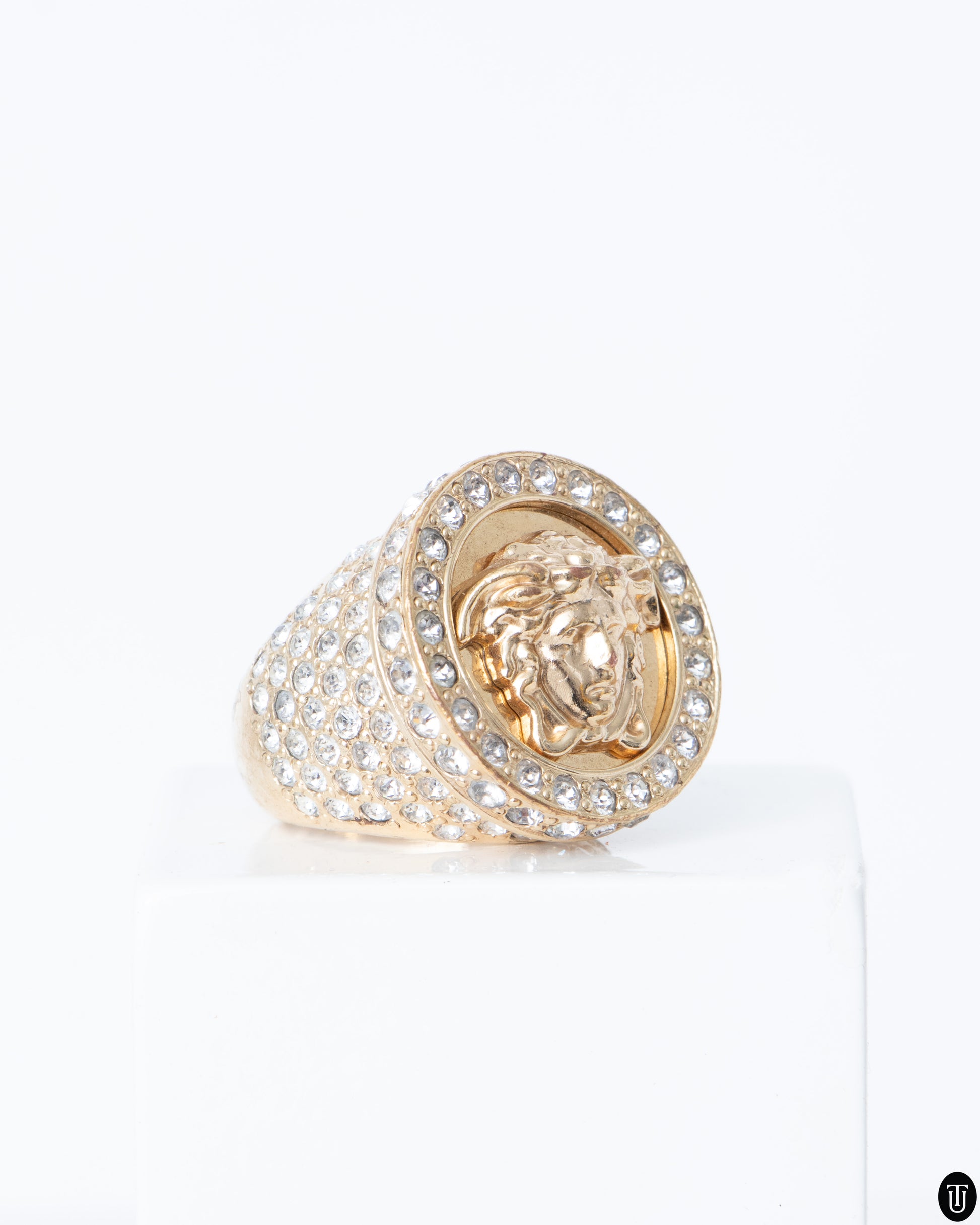 This 2000s Versace ring, features a gold-tone metal base adorned with numerous clear crystals for a luxurious, eye-catching sparkle. The centerpiece of the design is a raised Medusa head, a signature motif of Versace, encased within a circular frame also encrusted with crystals. The shank of the ring is wide and heavily embellished, adding to its opulent and regal aesthetic.