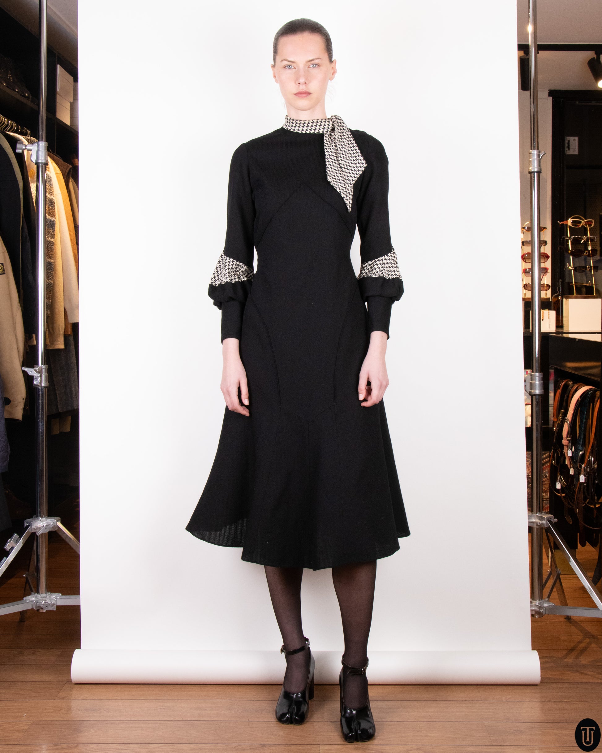 This beautiful handmade dress originates from the 1930s, and is crafted from a light weight wool crepe, and features checkered silk charmeuse accents along the neckline and elbows. The top of the dress is tailored to perfection to hug the body, while the skirt has a flowy loose a-line fit that falls around the mid-calf in length.