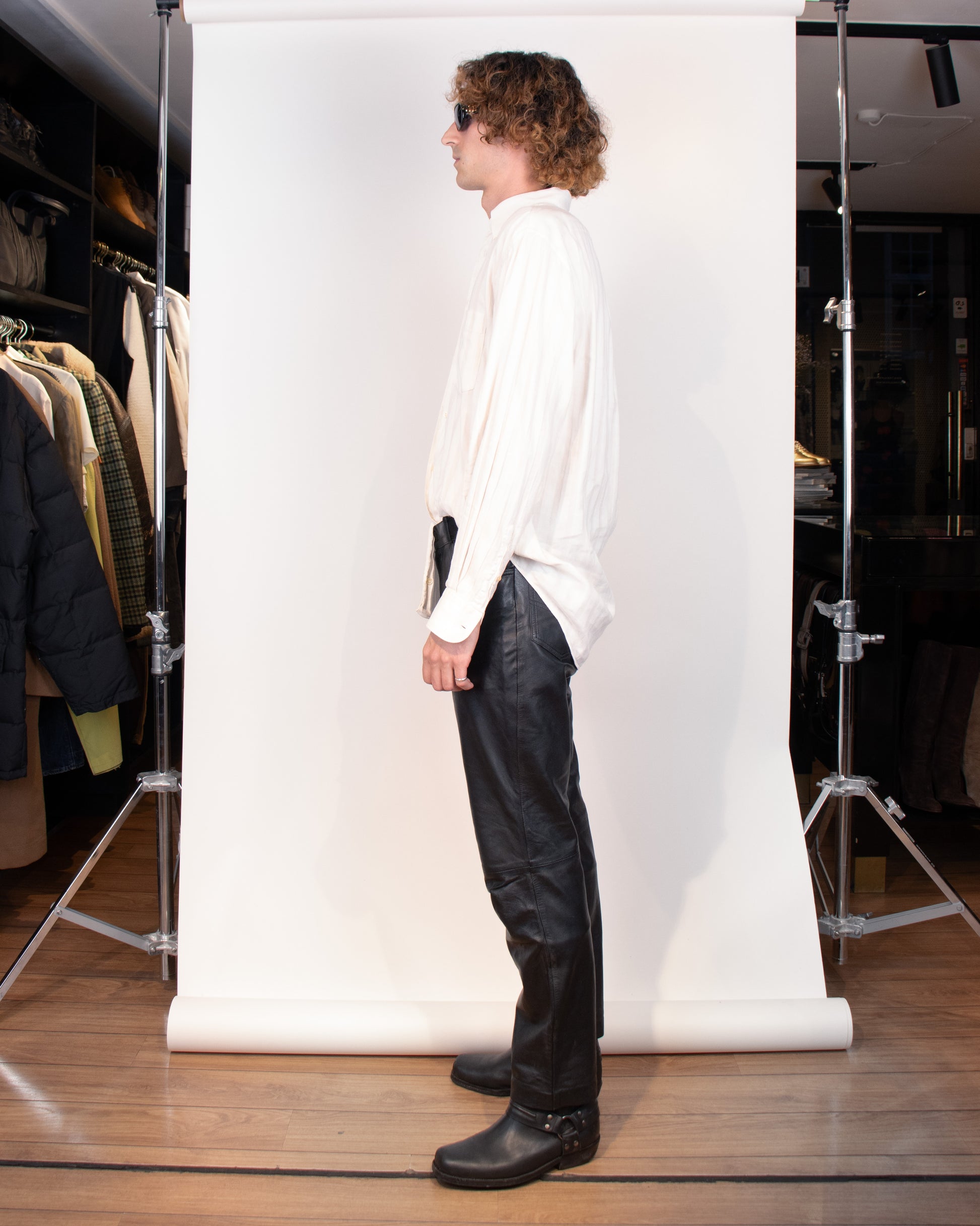 A pair soft Italian lambskin leather trousers from the 1980s with mid-rise waist and fitted silhouette. There are stitched round pockets in front and traditional pockets on the back.