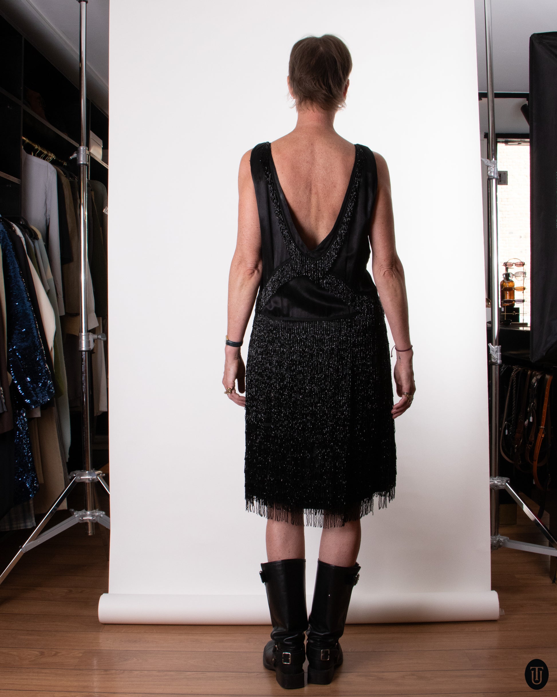 A beautifully crafted 1920s evening dress that combines fluid elegance with dramatic texture. The skirt is fully embellished with black bead fringe, creating movement, depth, and a luminous shimmer with every step. Expertly made with meticulous hand-finishing, this dress is a standout piece for special occasions—a refined blend of craftsmanship, sophistication, and tactile luxury.