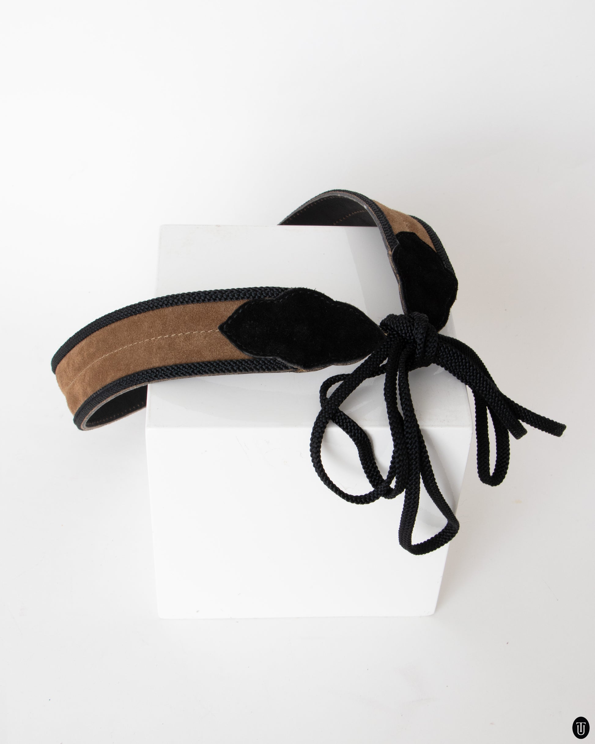 This 1970s Yves Saint Laurent belt is made from rich brown suede with black suede and leather accents, showcasing a sculptural design at the center. A thick black cord ties at the front, adding texture and a modifiable finish to the minimalist silhouette. Elegant and bold, it reflects YSL’s signature blend of structured tailoring and sensual detailing, ideal for cinching dresses or high-waisted trousers.