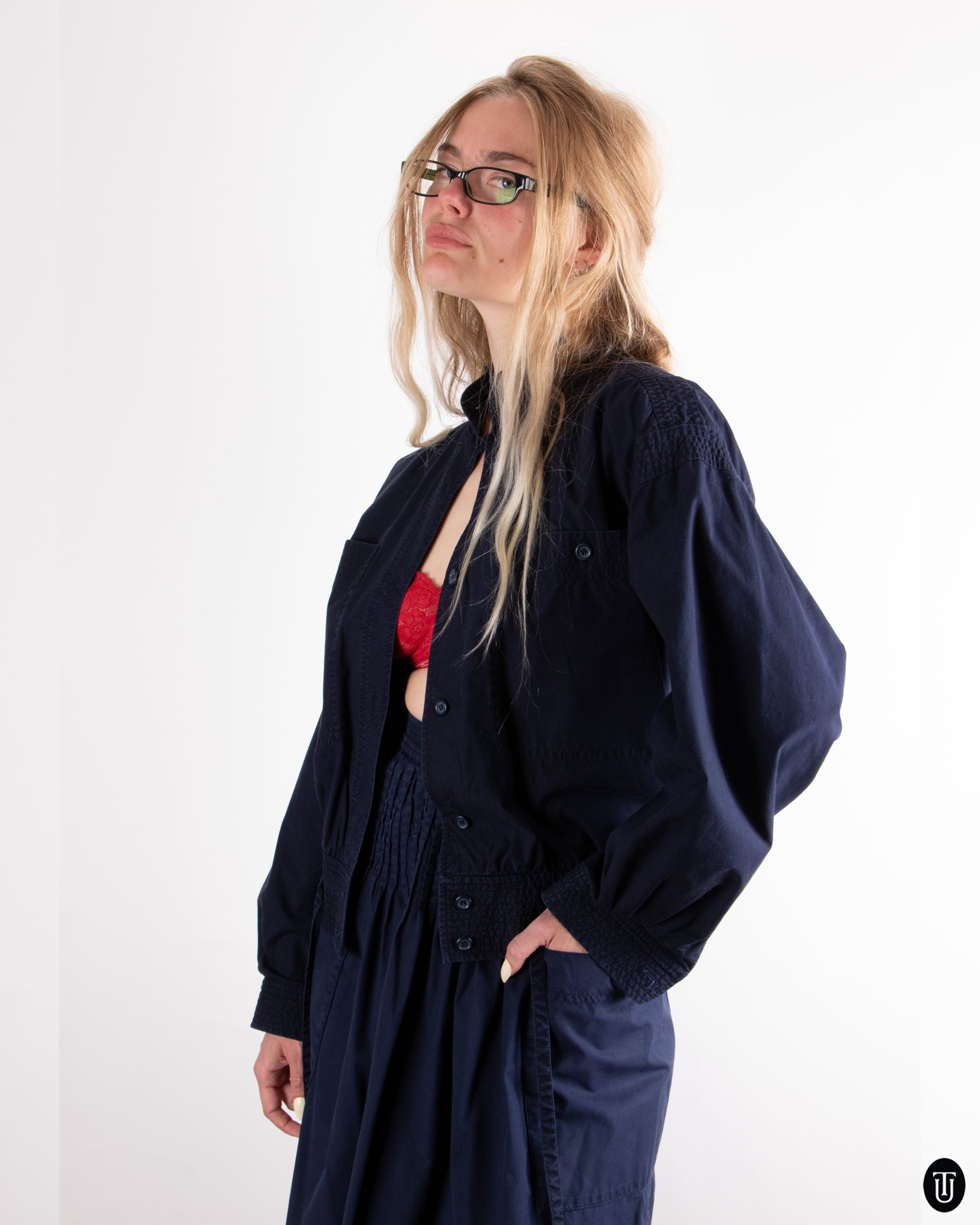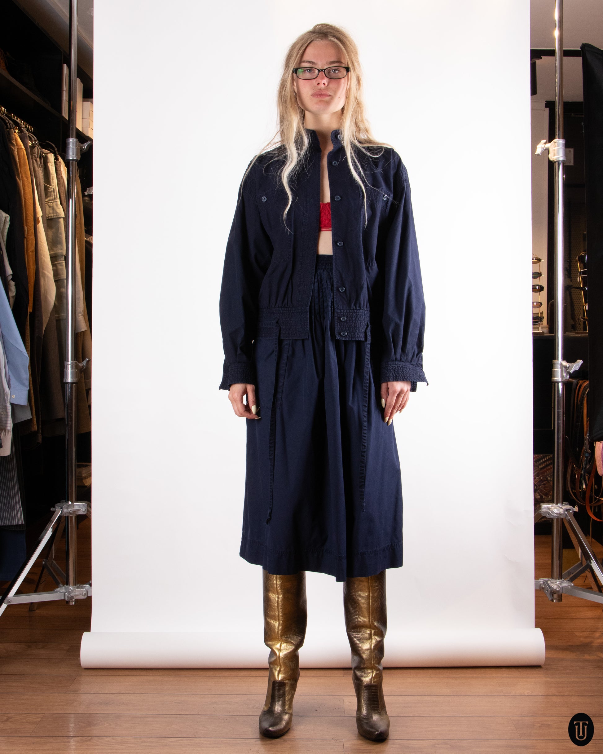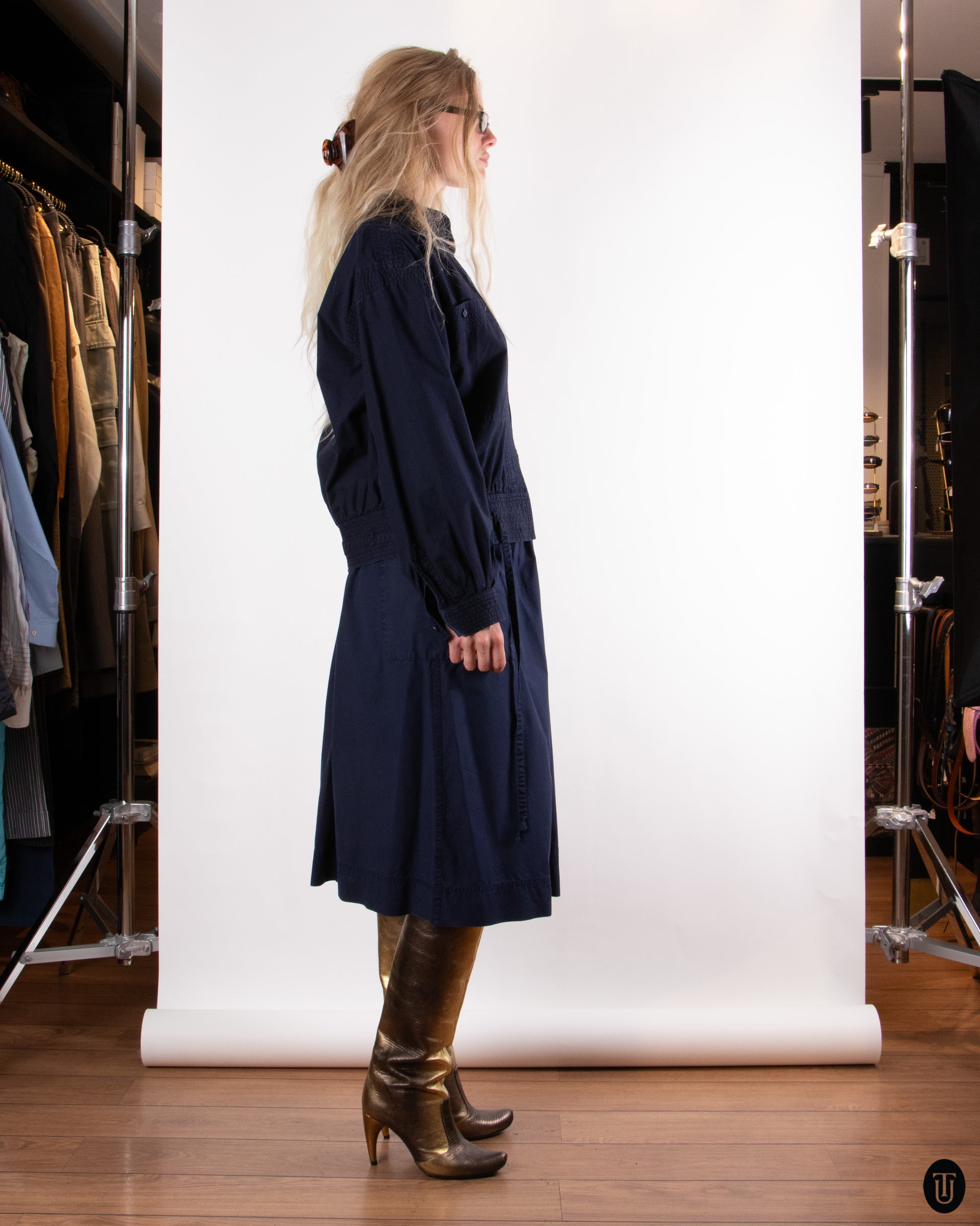 This 1970's Yves Saint Laurent skirt ensemble is a masterclass in tailoring and subtle luxury. The set is crafted from a midweight cotton in a deep rich navy hue. The jacket cut is military inspired contrasted with a very feminine semi-circle skirt, with micro pleating around the waist line. The set is true to YSL's legacy of strength in femininity in tailoring.