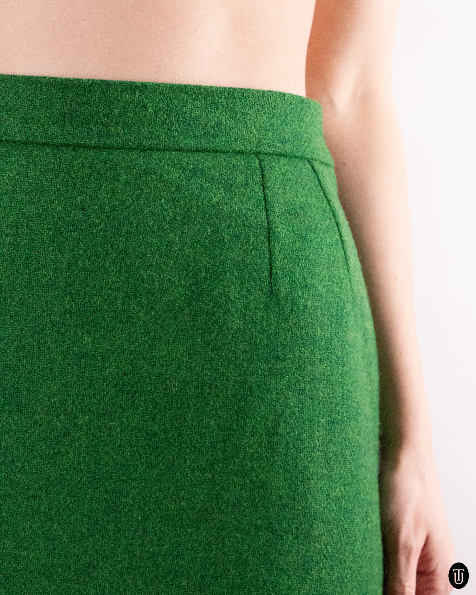 This 1980s YSL ensemble of a jacket with sculpted shoulders and a three-button front and a matching pencil skirt is crafted in a vibrant green wool fabric. The suit embodies the material quality of true vintage YSL. As a sophisticated statement look, it is perfect for anyone seeking elevated power dressing.