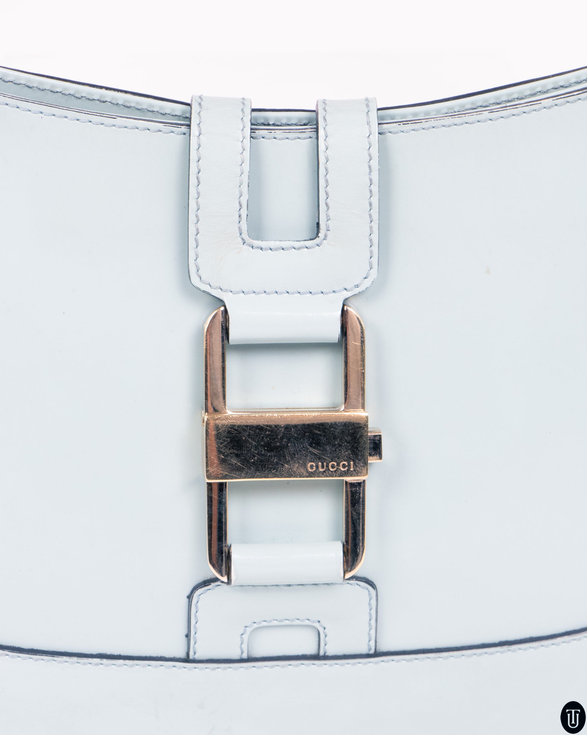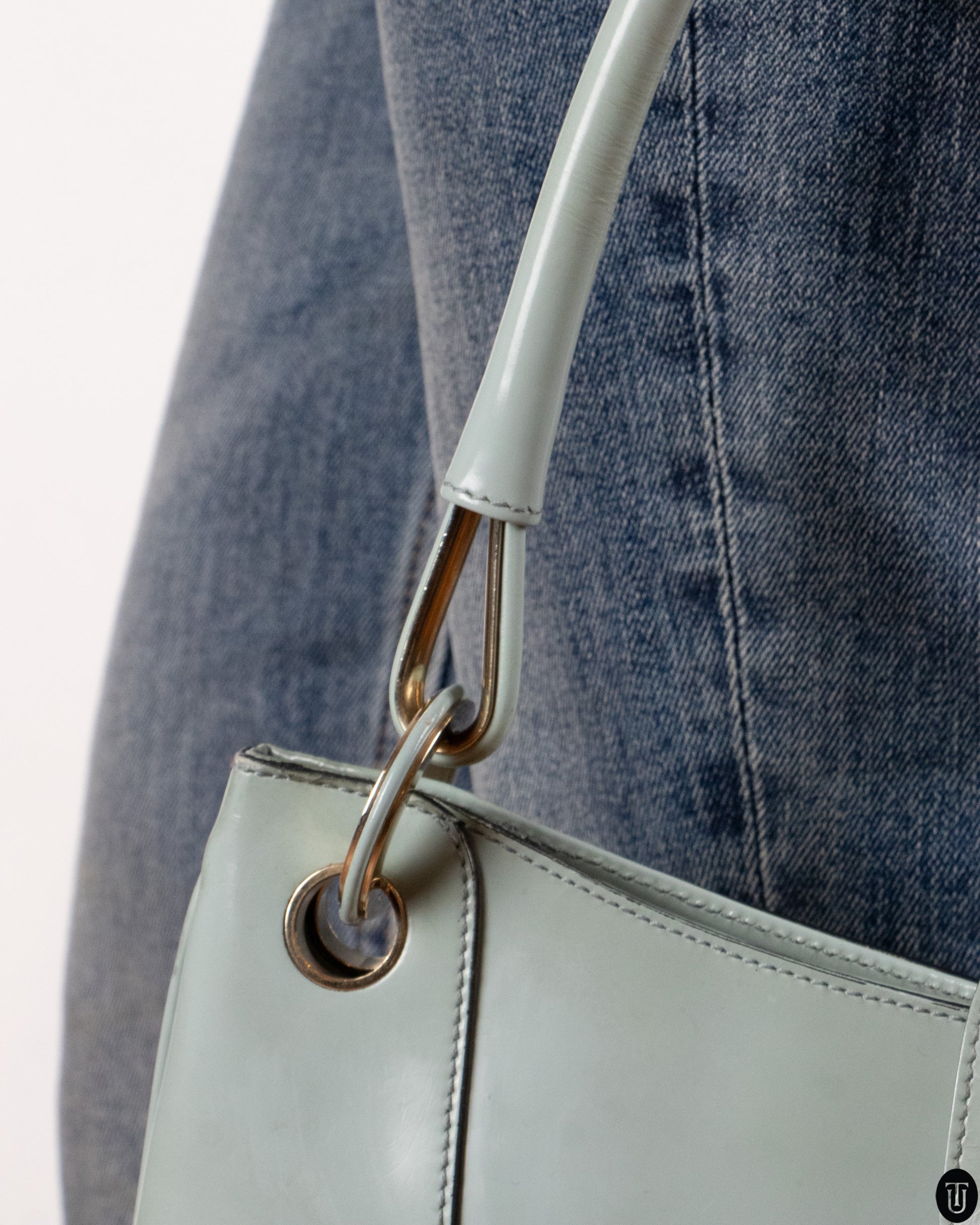 This 1990's Gucci Tom Ford Patent leather bag in Tiffany blue is the reissued 1961 Jackie bag. Crafted in smooth calfskin leather, the bag features a sleek, structured silhouette, with the signature piston lock closure, rendered in polished gold-tone hardware and subtly engraved with "GUCCI".