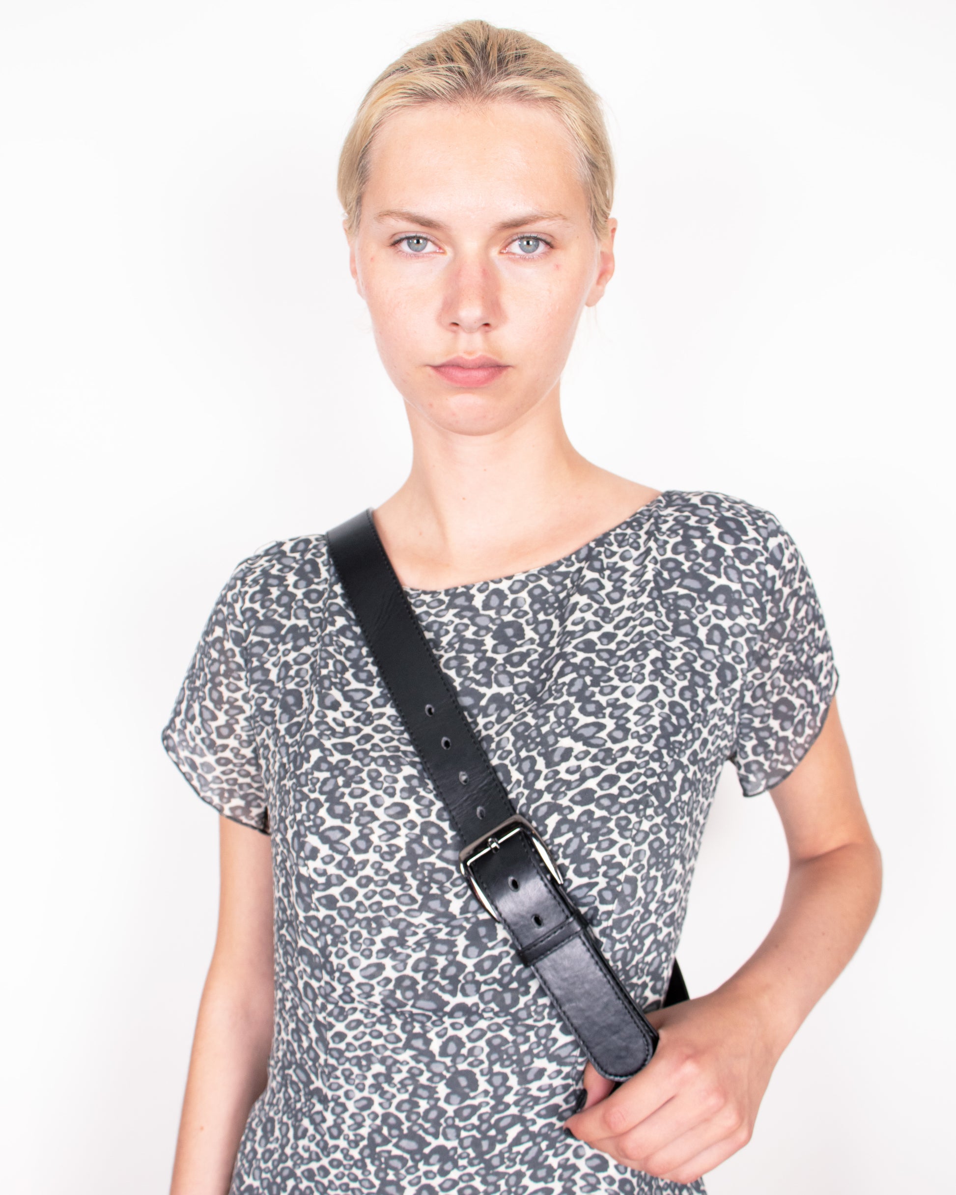 This 90s Claude Montana Leopard Print Maxi Dress features a subtle, abstract leopard pattern in monochrome tones, creating a sleek and refined aesthetic. The dress has a relaxed, flowing silhouette with short sleeves and an asymmetrical hemline, giving it a contemporary yet classic appeal.