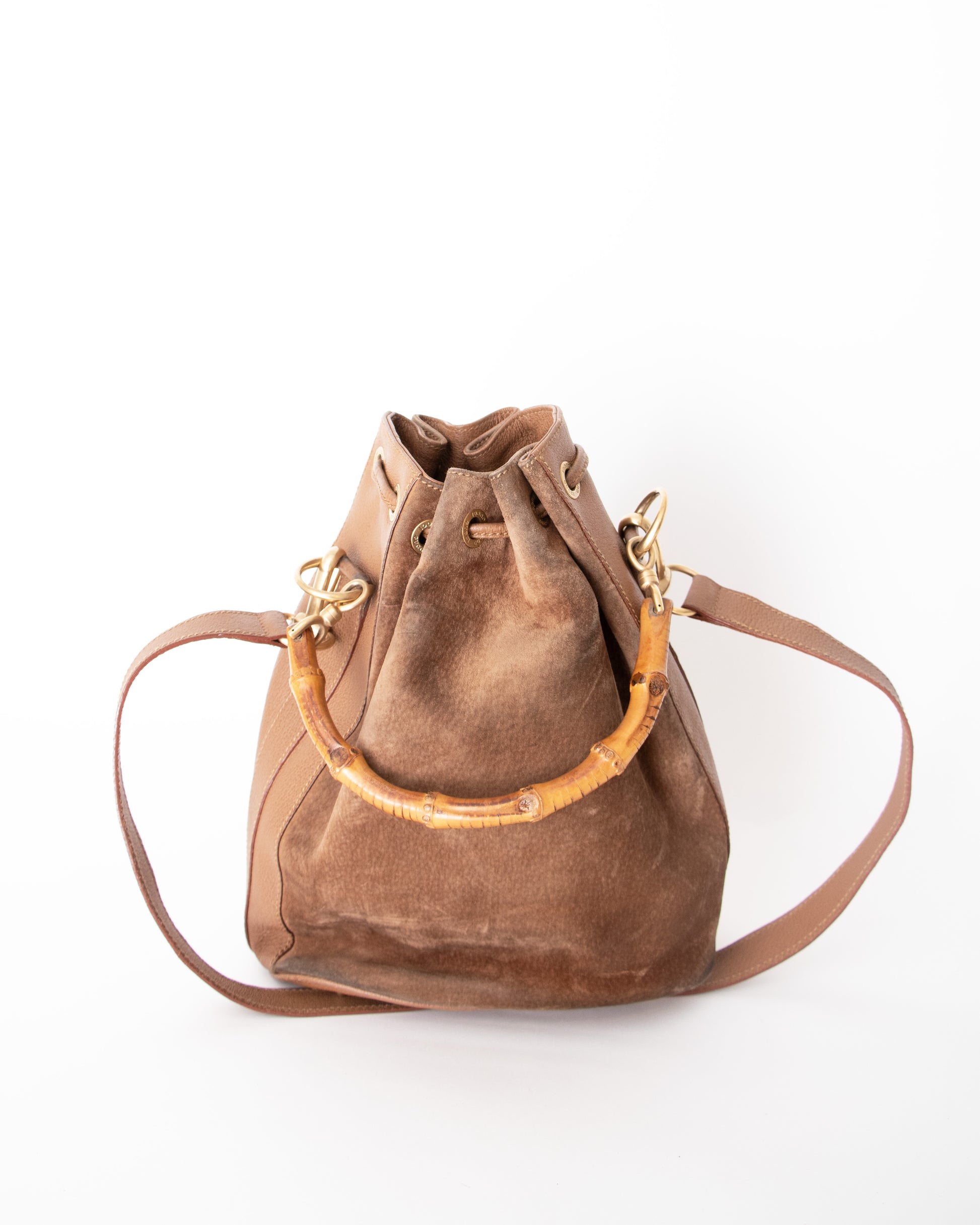 A Caramel Brown 70s drawstring Gucci Purse, constructed from suede and leather. The bag features a detachable shoulder strap, canvas lining, an inner pocket, and a bamboo handle.