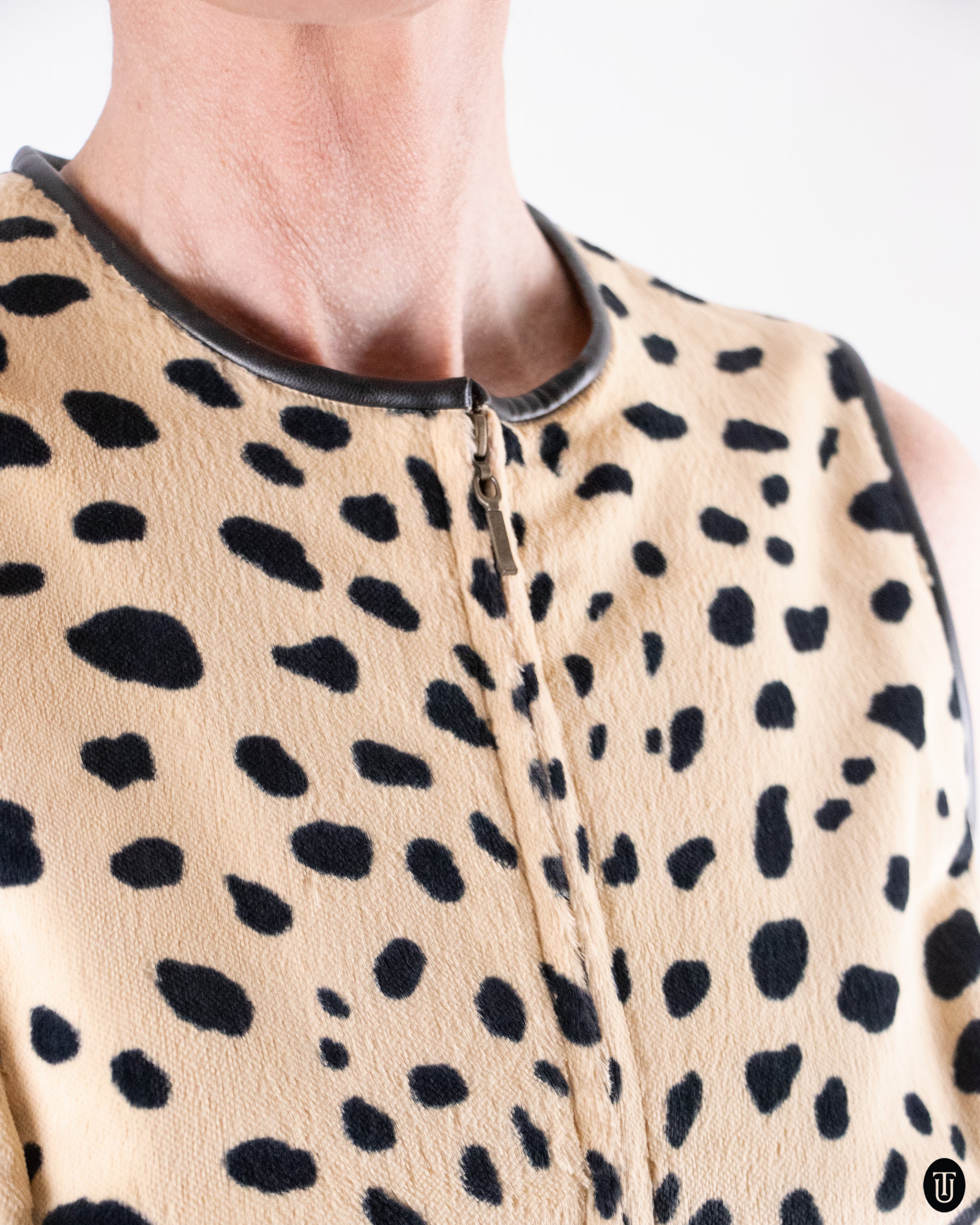 This 1990's Emanuel Ungaro skirt set is expertly crafted from a cotton blend that gives a faux fur feel for the set. The graphic leopard print adds edge to an otherwise minimal shape. The top features a zipper closing and sits right at the waist line, while the skirt effortlessly hugs the body giving that classic 90's look.