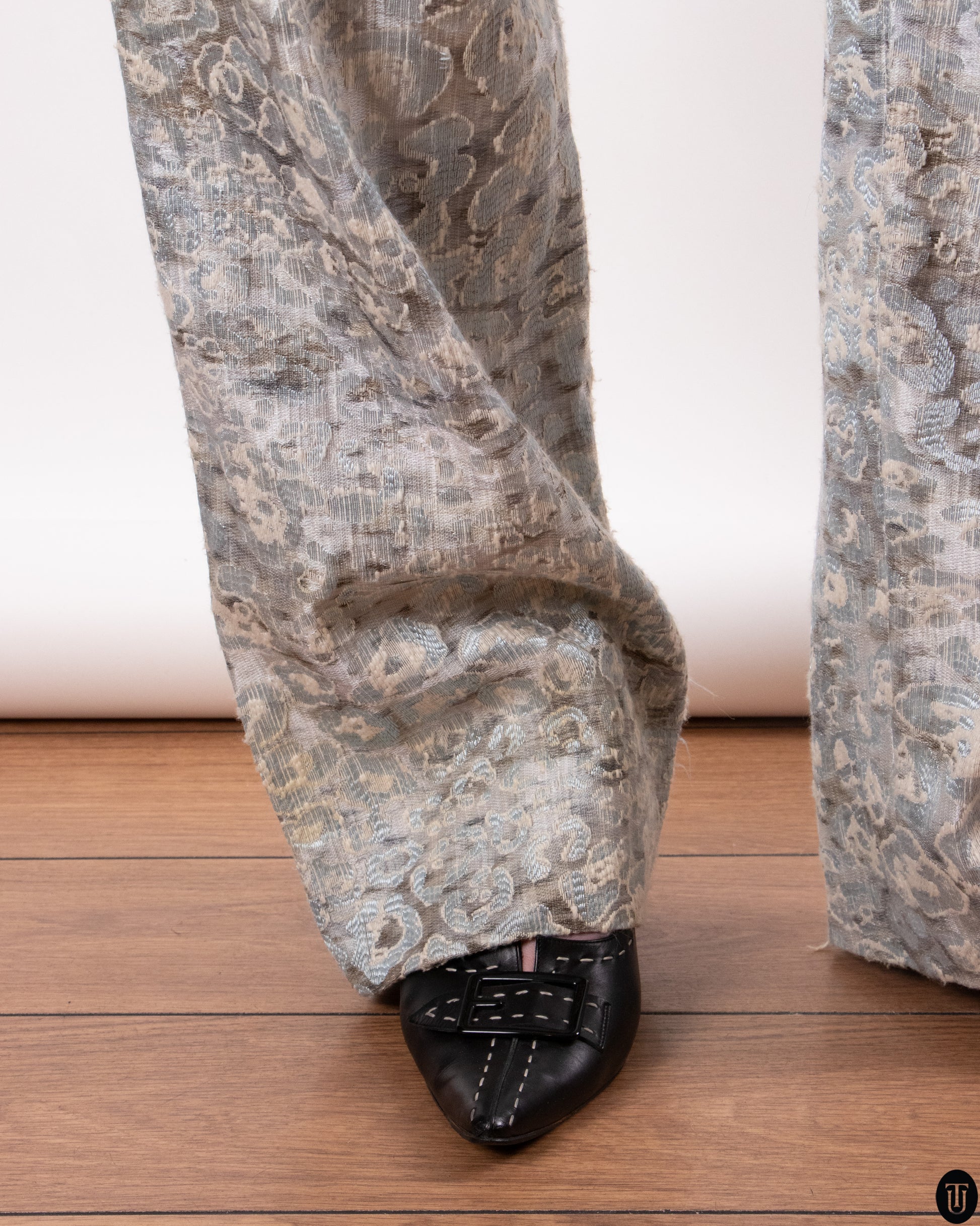 These 2000s Valentino trousers feature a luxurious jacquard weave with an intricate, almost iridescent pattern in cool, muted tones. Cut with a relaxed, wide-leg silhouette, they balance opulence with ease. The textured fabric catches the light beautifully, adding dimension and quiet sophistication to any ensemble. The trousers close Center front with a zipper and inner button.