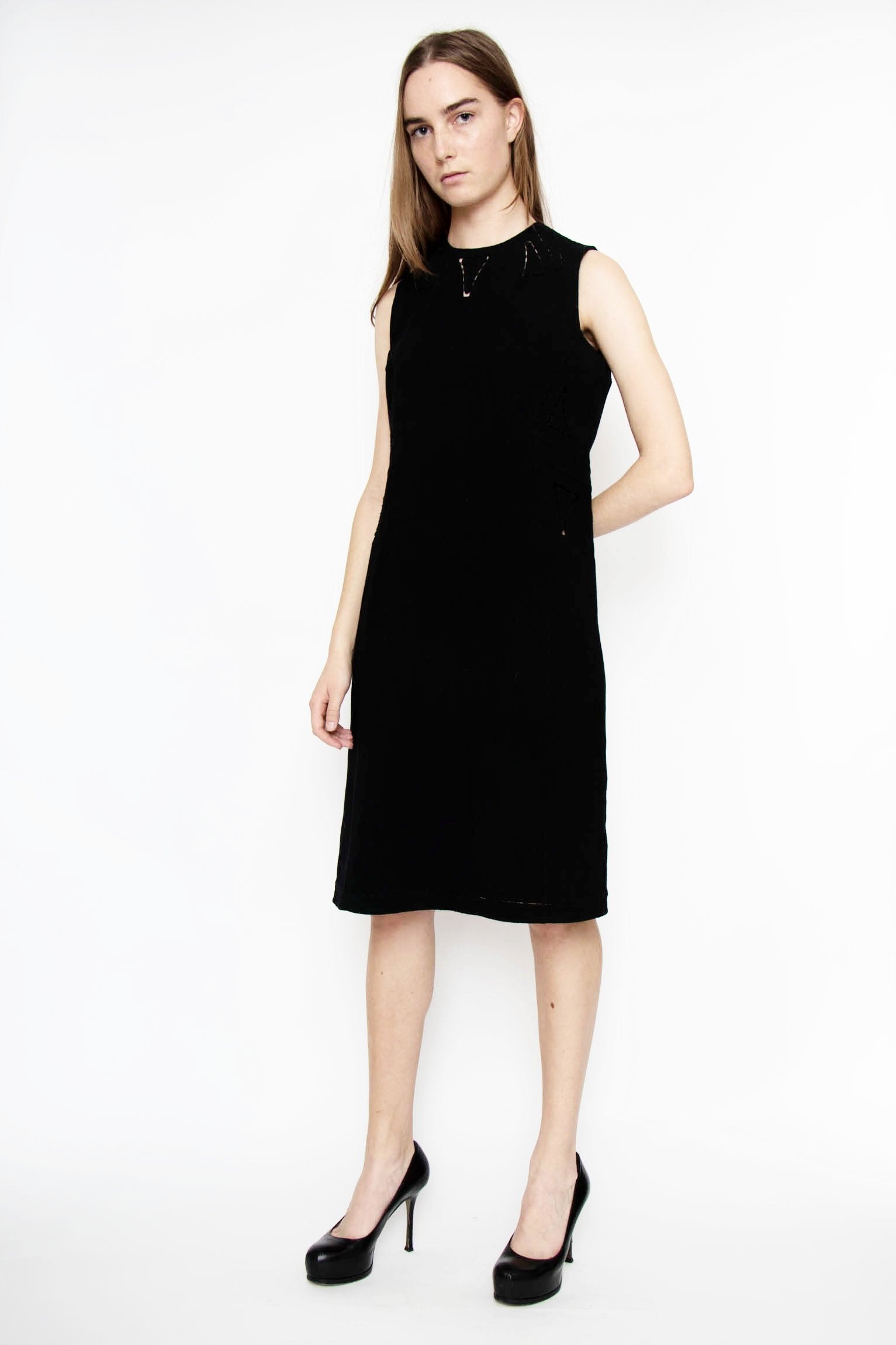 A classic black sleeveless shift dress from Chado Ralph Rucco with a round neckline and elegant stitched and laser-cut details. This elegant piece is fully lined and has a back zipper and hook & eye closure at the collar.